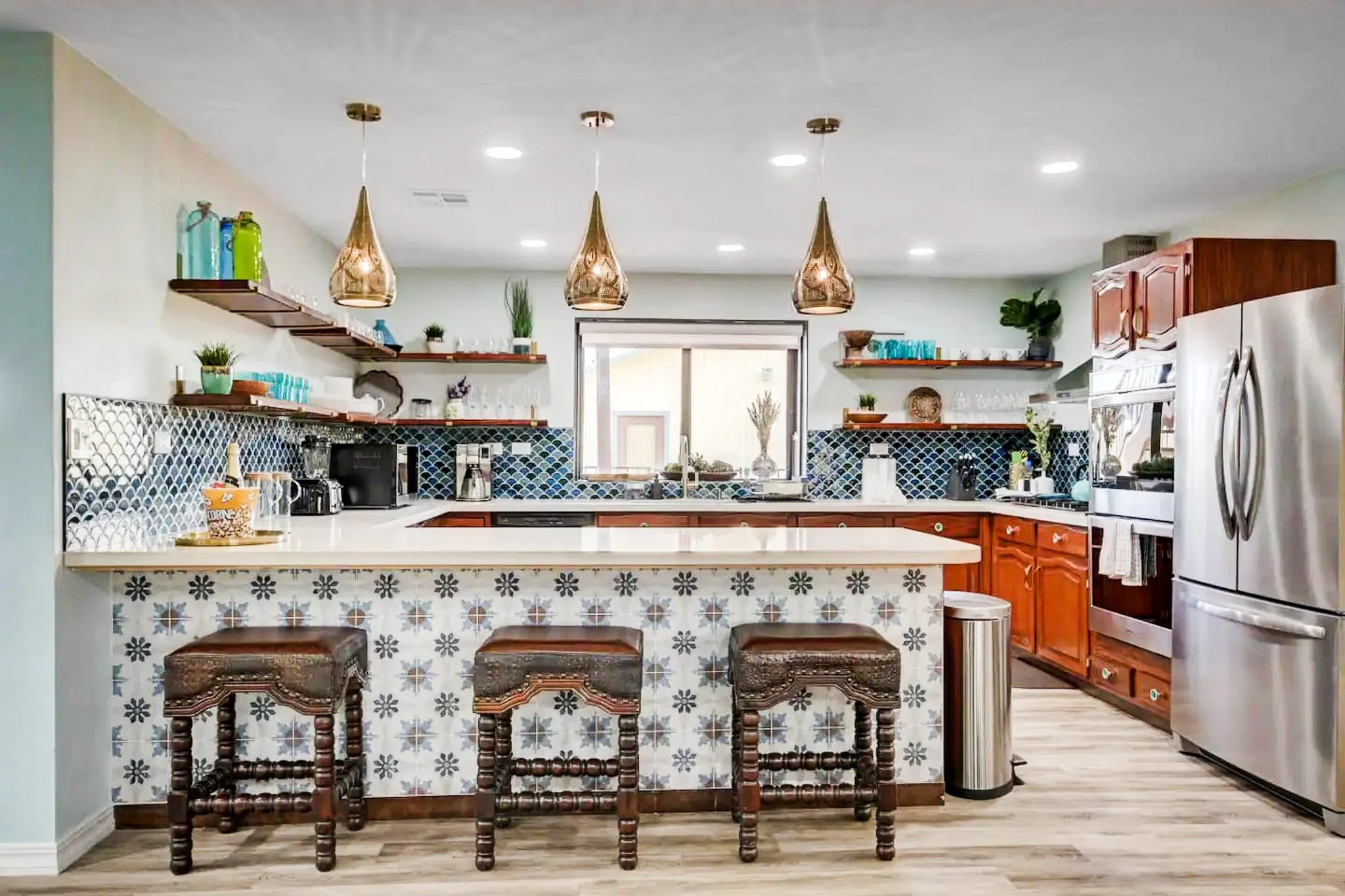 The open-concept kitchen is a pop of vibrant color in the middle of the home. It’s packed with essentials and gadgets to help you prepare and cook meals for a hungry group. The open shelves are lined with glasses and dishware, and you’ll find more utensils in the cherry oak-colored cabinets.
