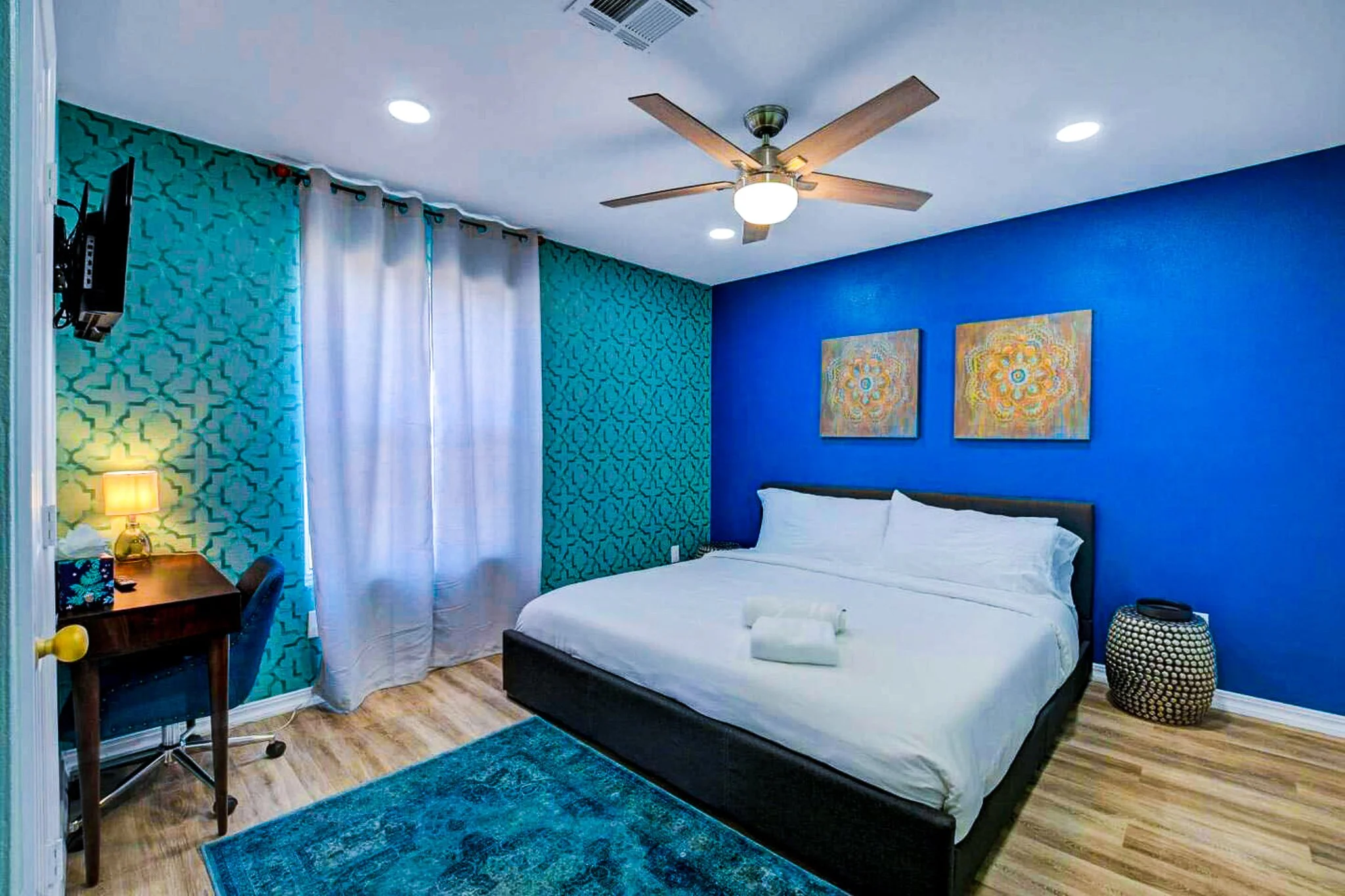 The master bedroom is a gorgeous blend of blues, whites, and golds. It features a King bed, Asian-inspired accents, and a plush area rug on top of hardwood floors. Thanks to its location downstairs, the room is slightly more private than the others.