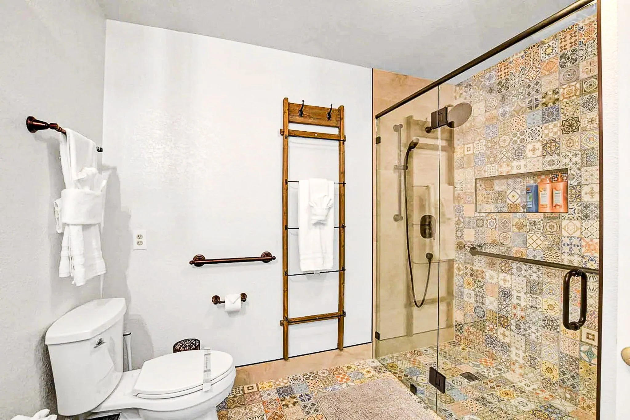 The bathroom near the pool features a walk-in shower with a waterfall showerhead behind glass walls. Another bathroom features an open and accessible shower area with hand-painted tile work from floor to ceiling, designer light fixtures, two mirrored sinks, and gorgeous attention to detail.
